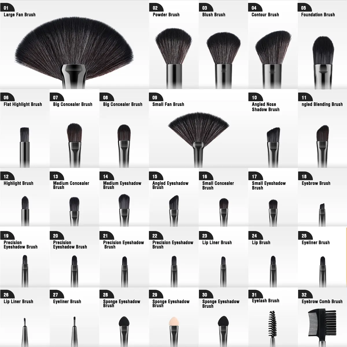 Used as a foundation brush,powder brush,blush brush,eyeshadow brush,the brushes well work for makeup.